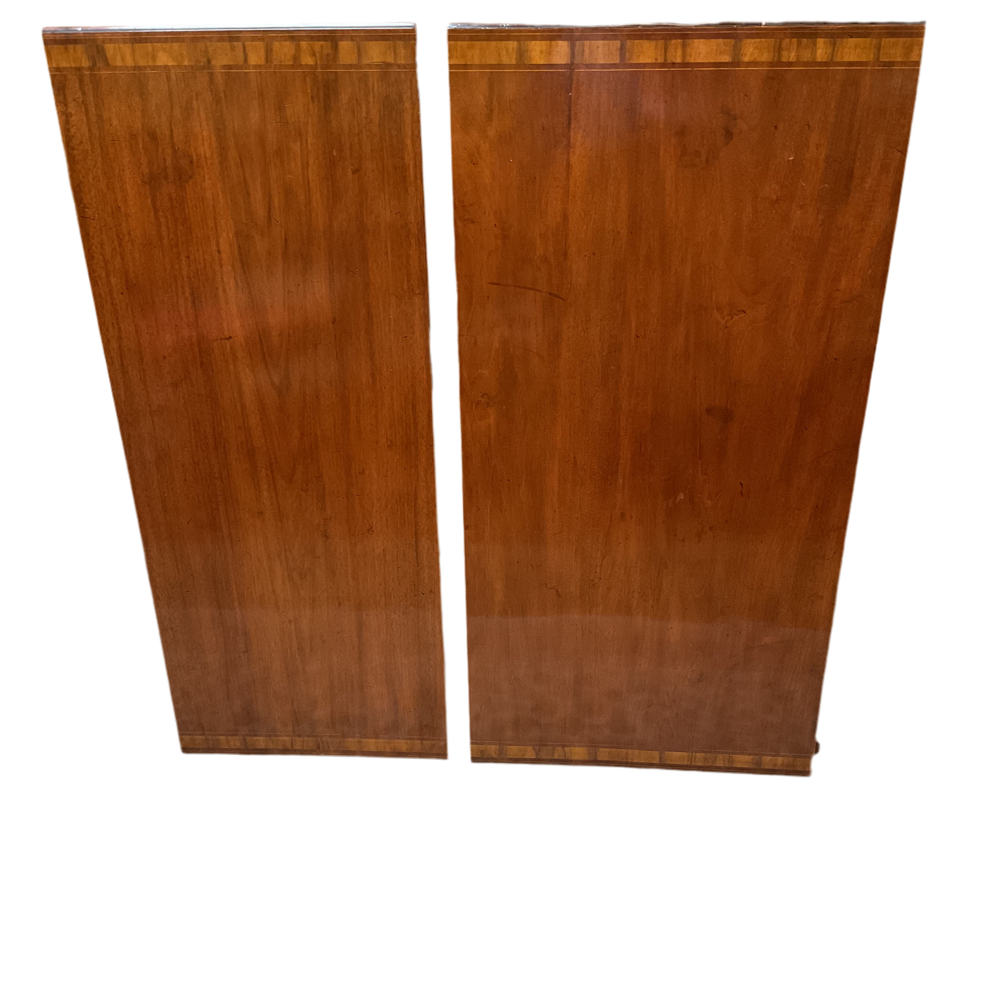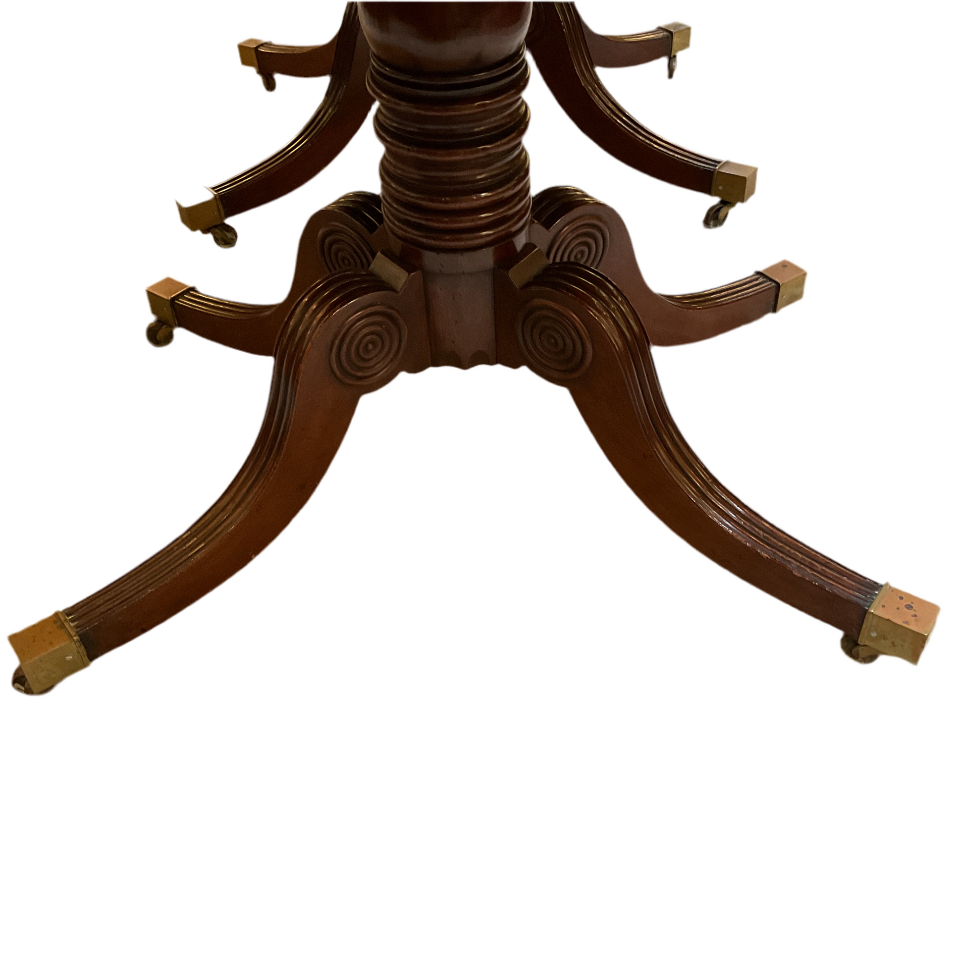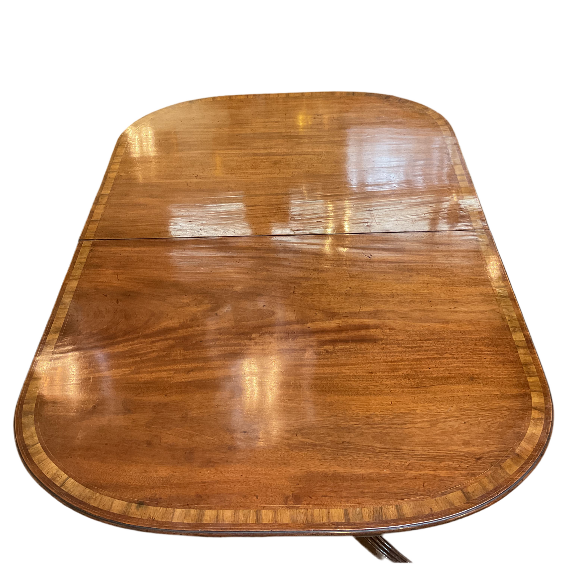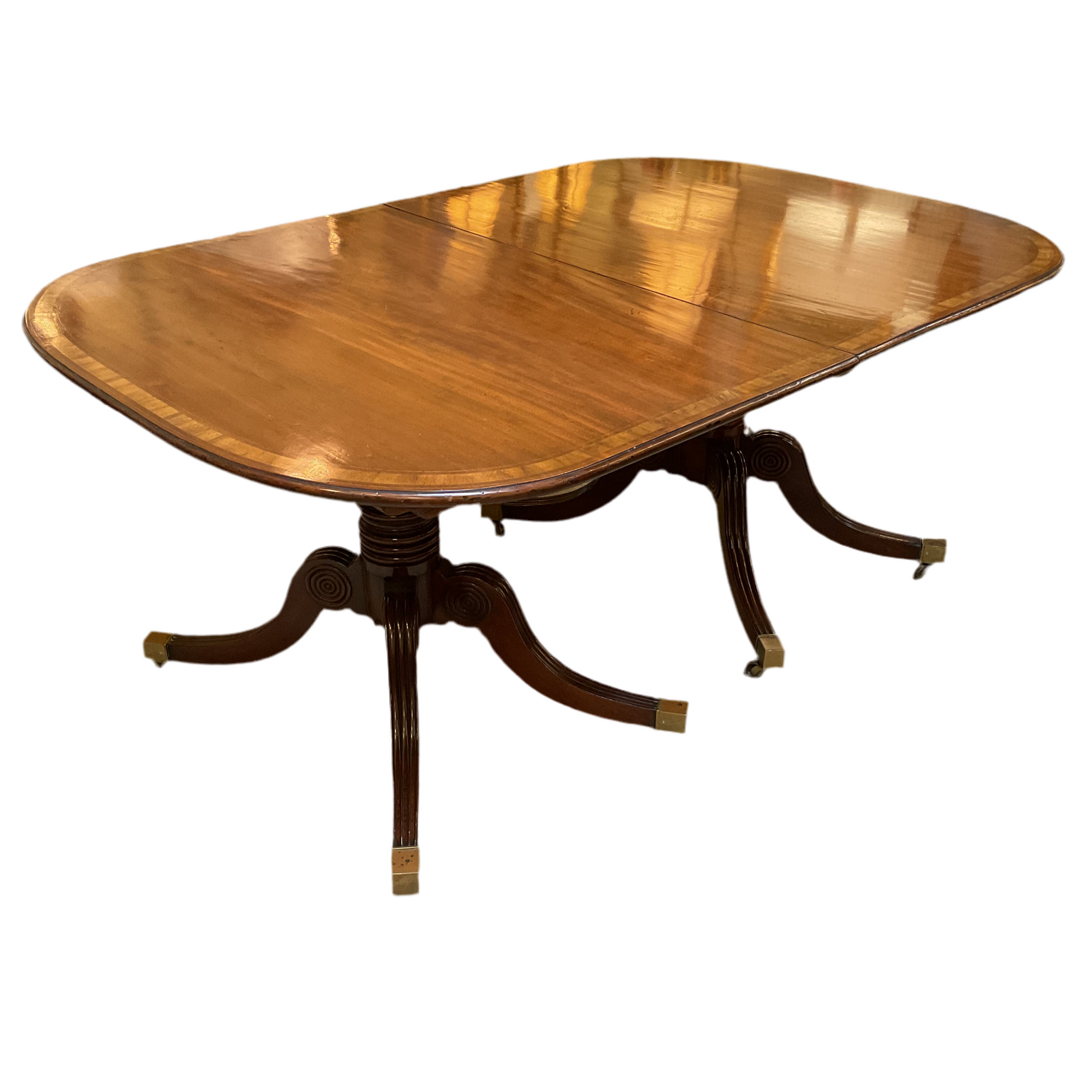 Antique English mahogany dining table. Double pedestal on casters with two leaves 18.5” & 22.5”.