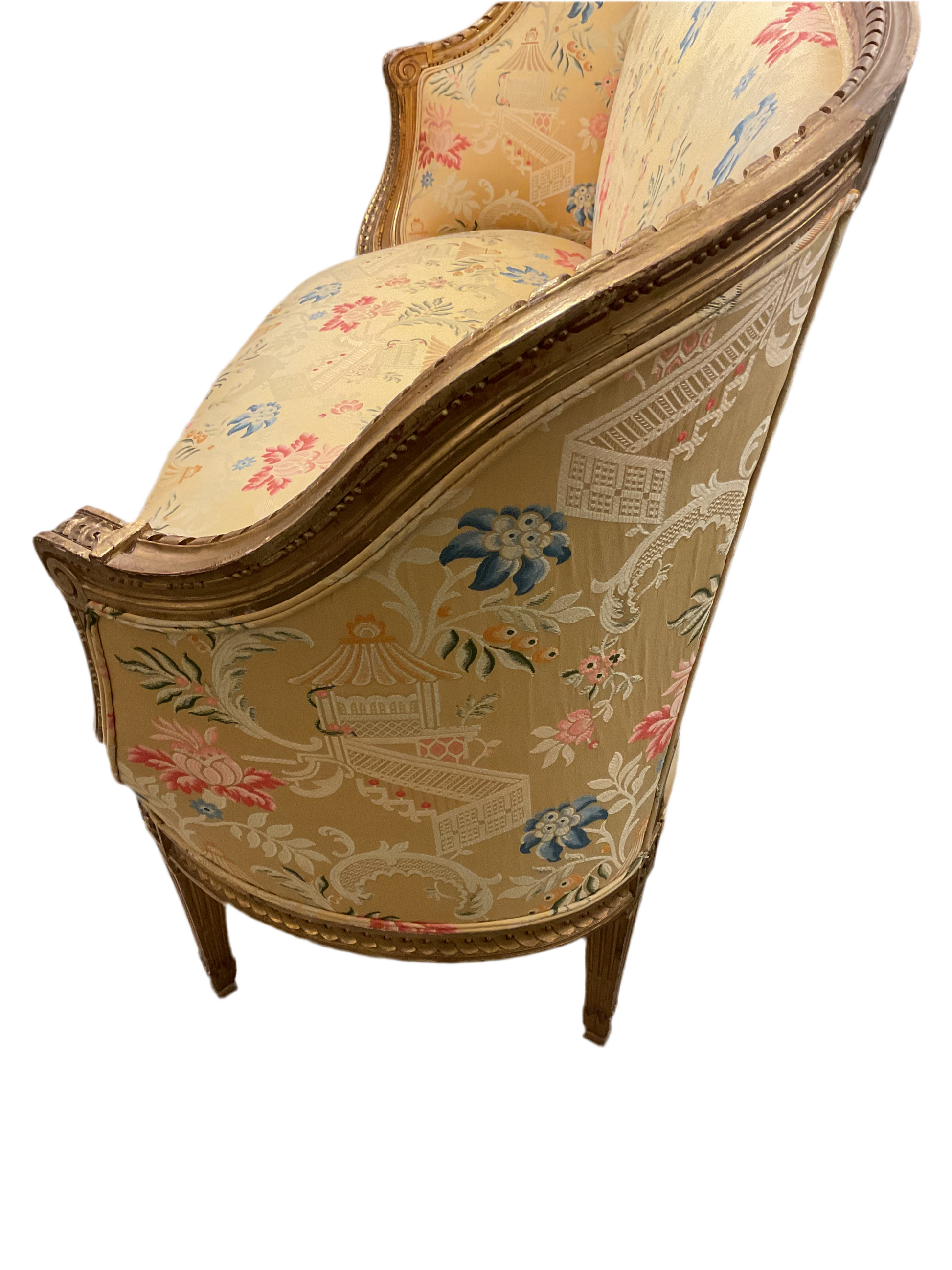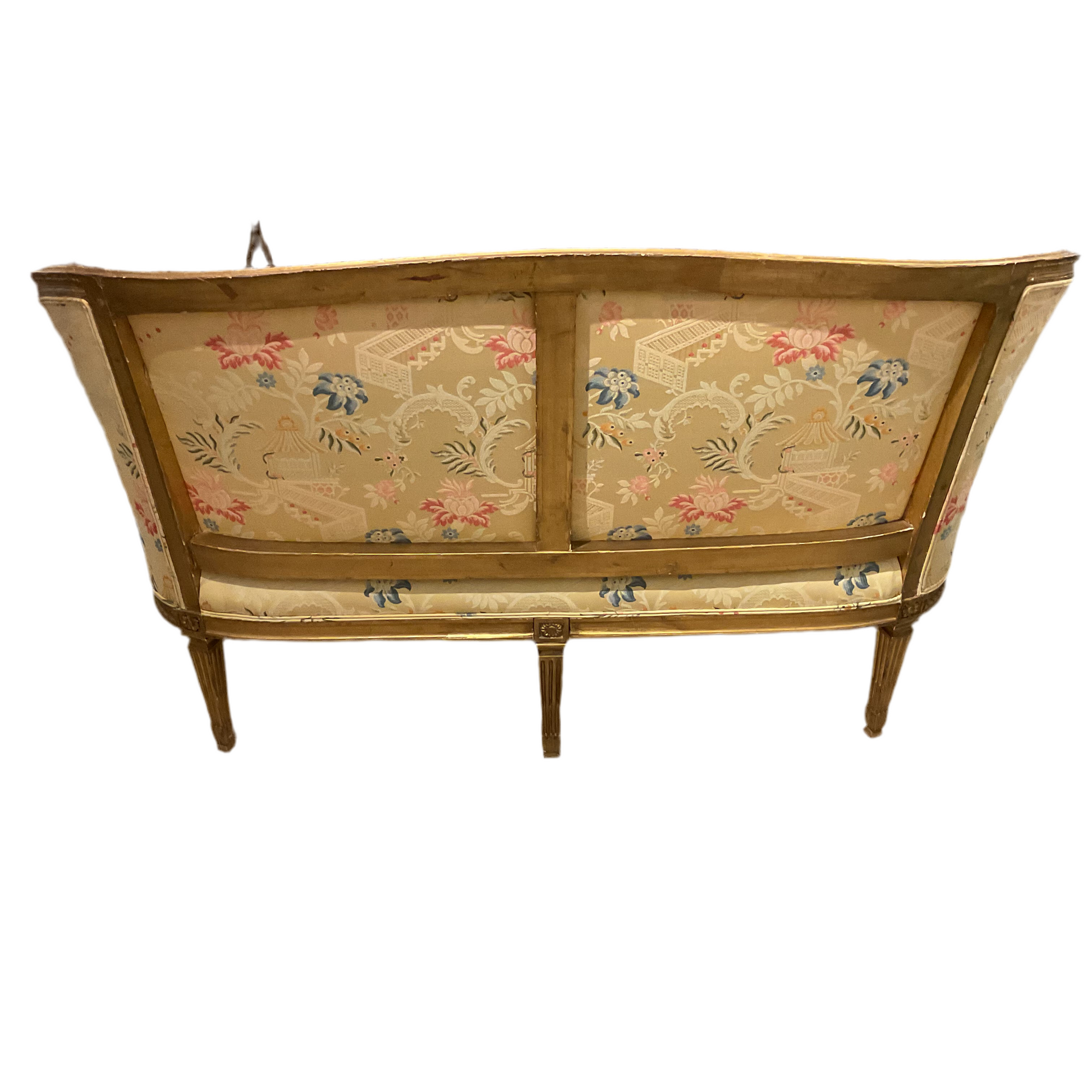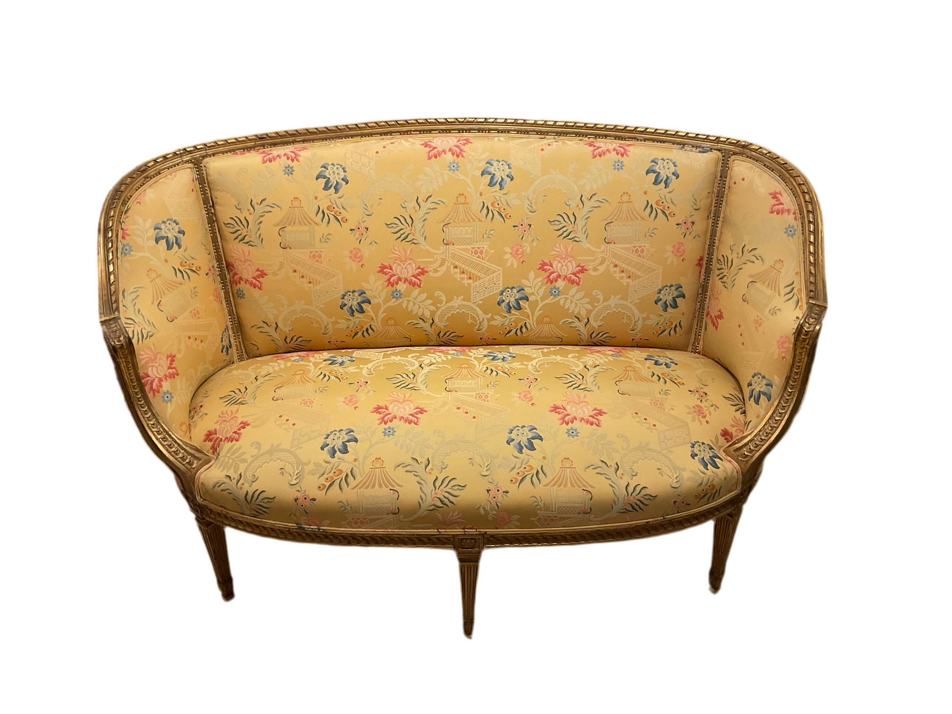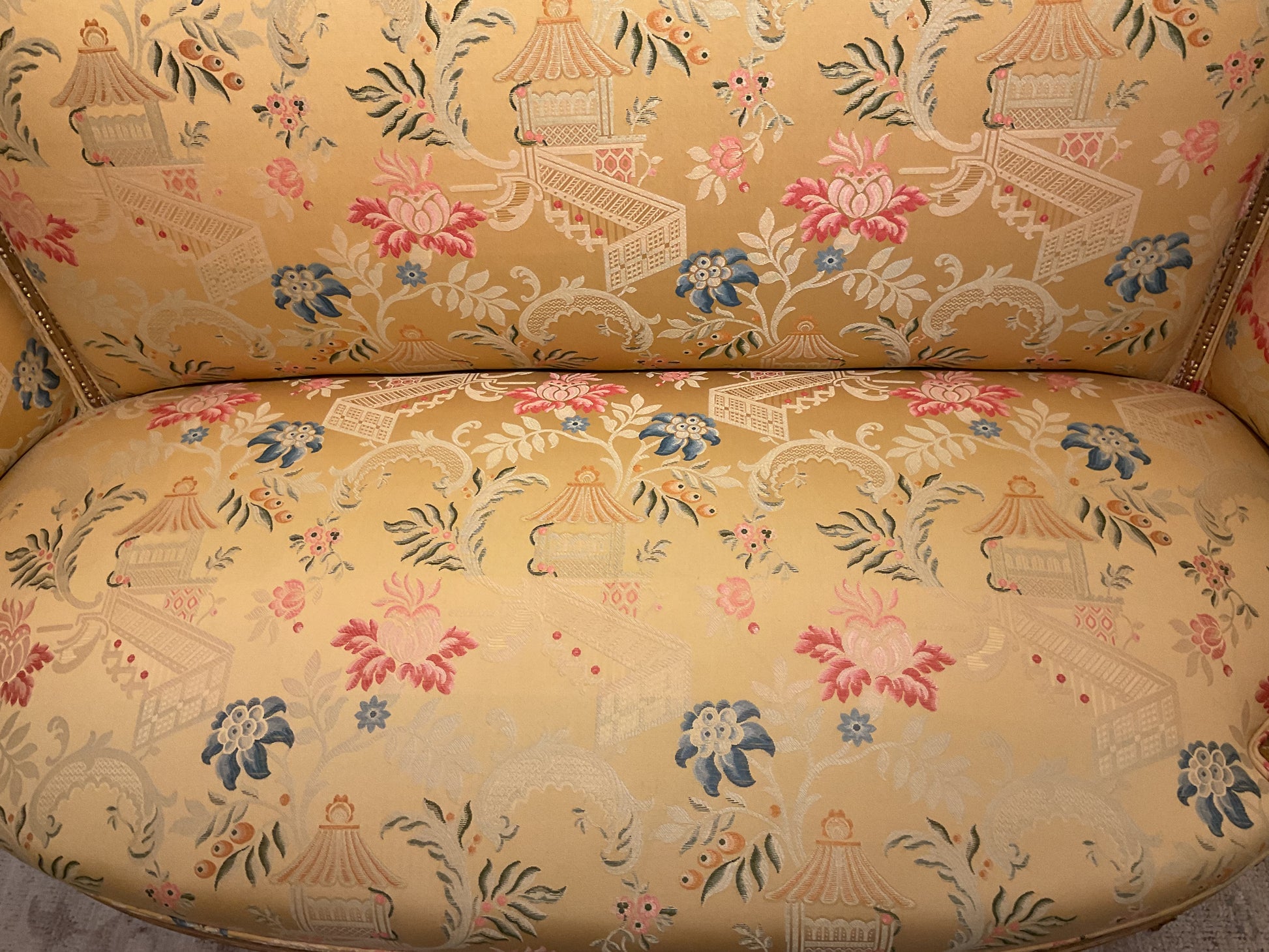 Antique Louis XVI giltwood settee with Scalamandre upholstery.