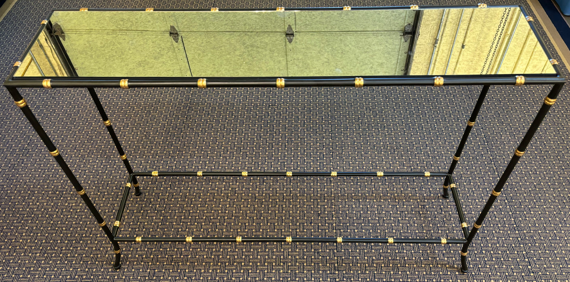 Black metal console with a faux bamboo design and gilt accents. Smoked mirror top.