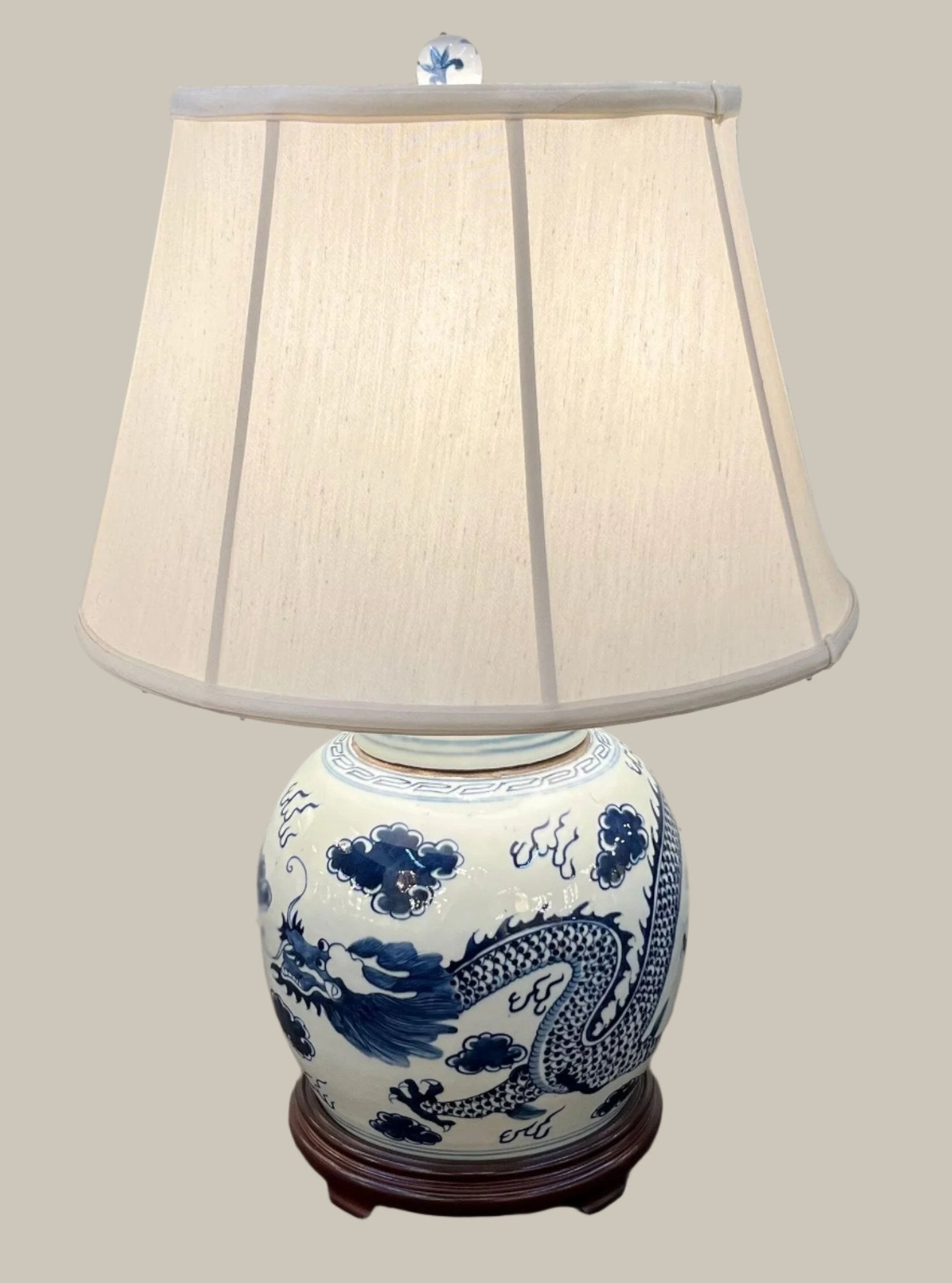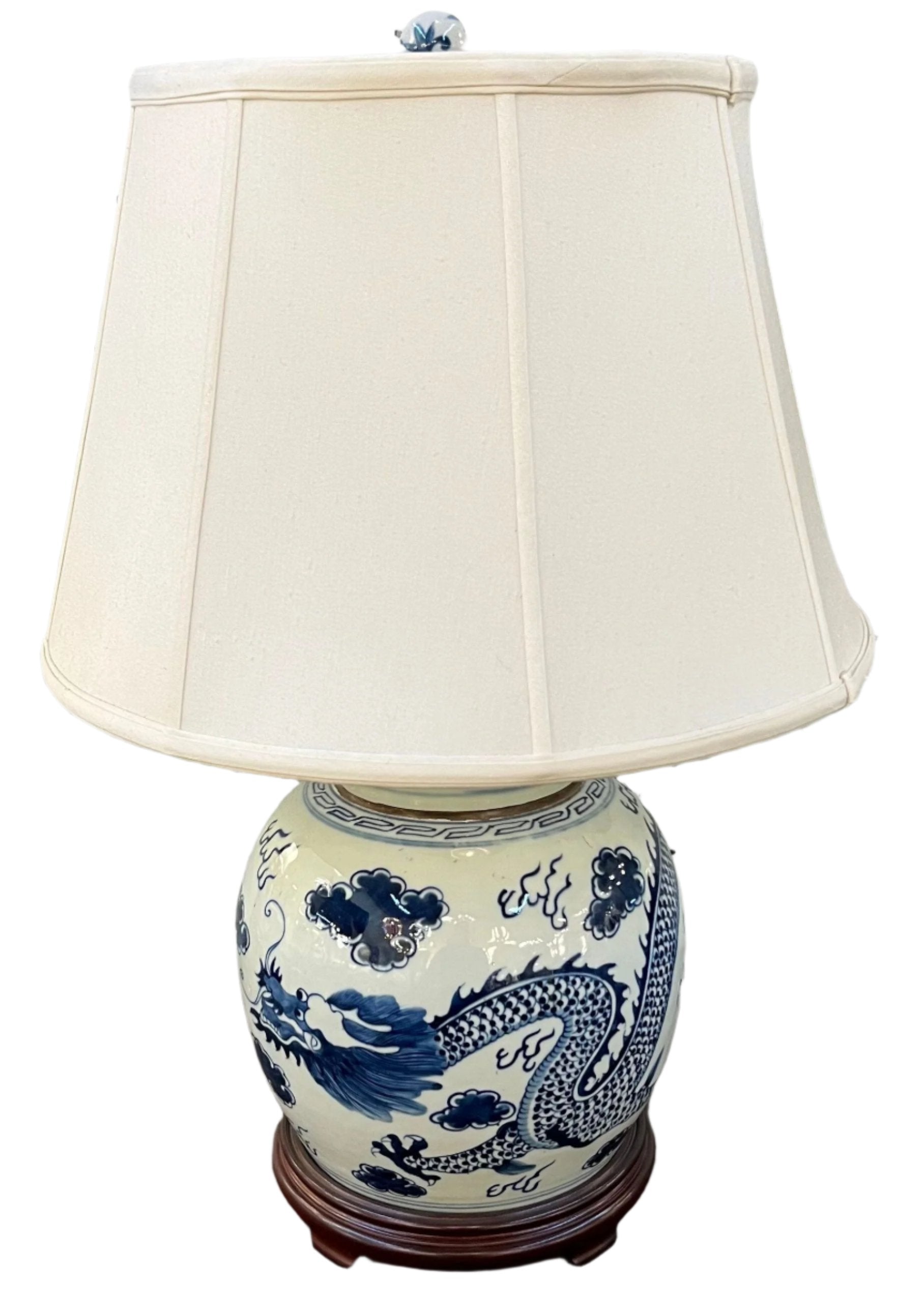 Blue and White Dragon Ginger Jar Lamp. 26"H. 18"Dia