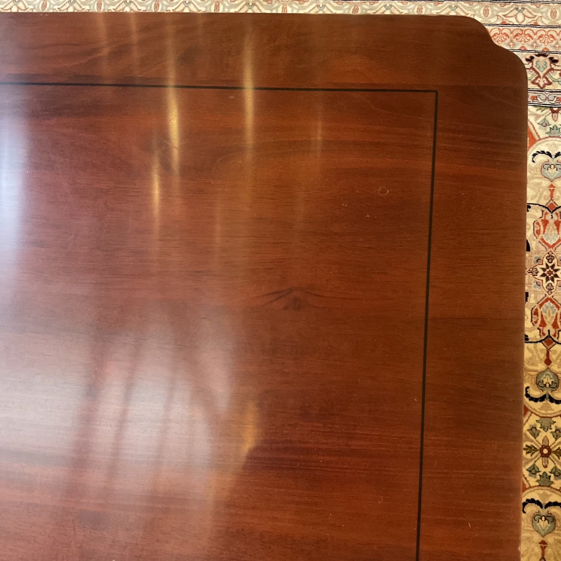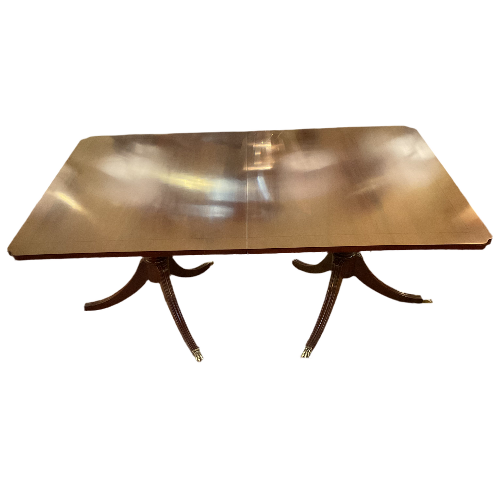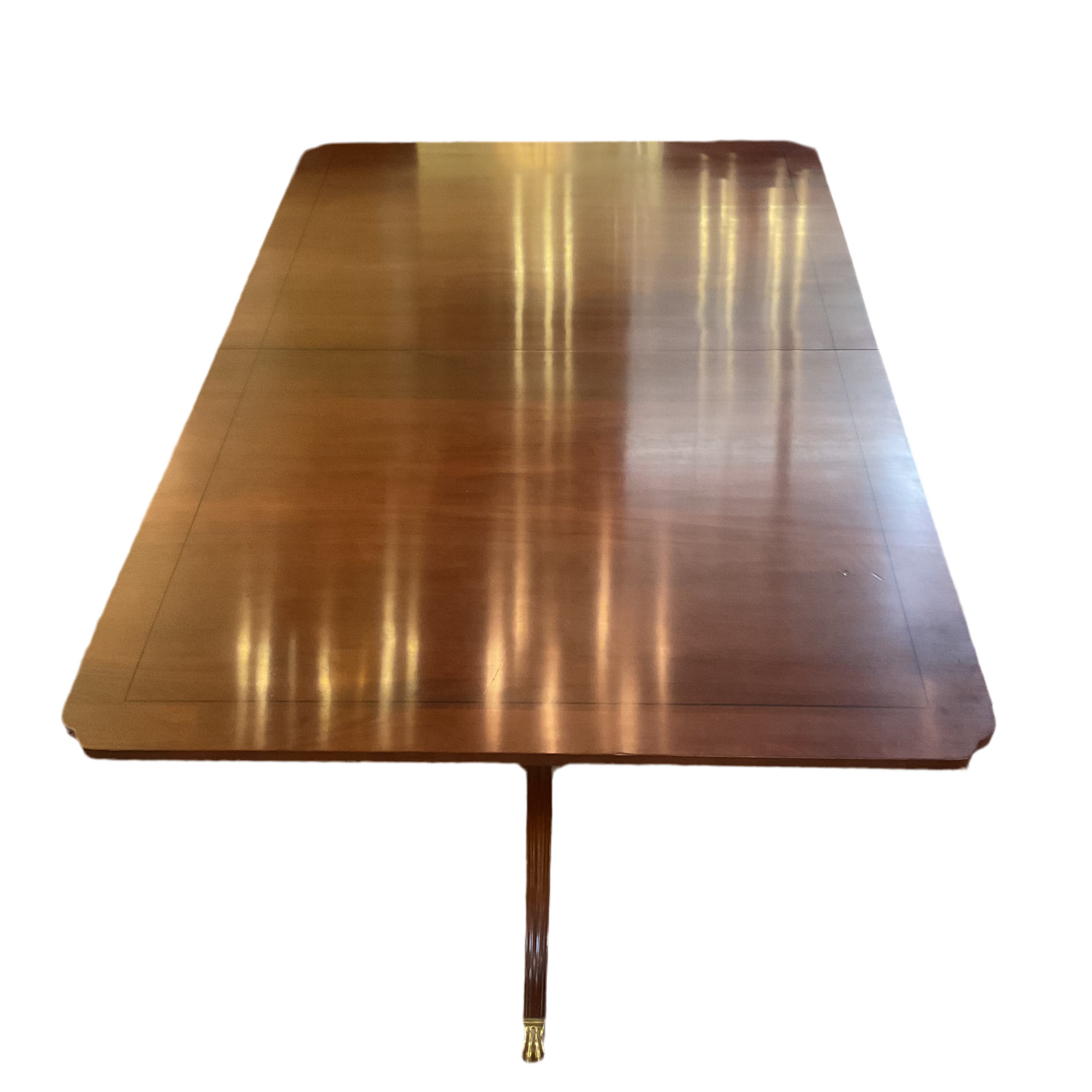 Regency style double pedestal mahogany dining table with two 22” leaves.