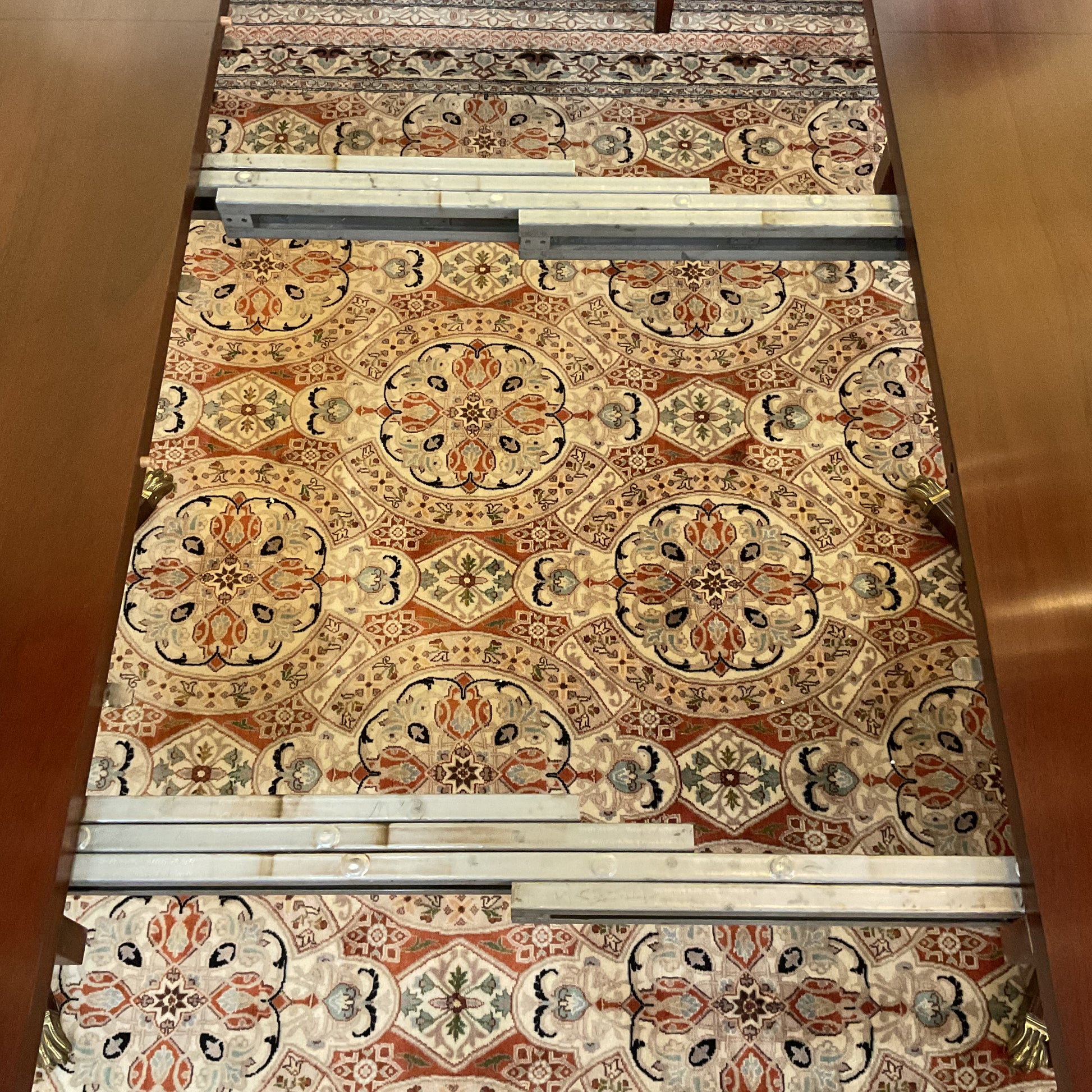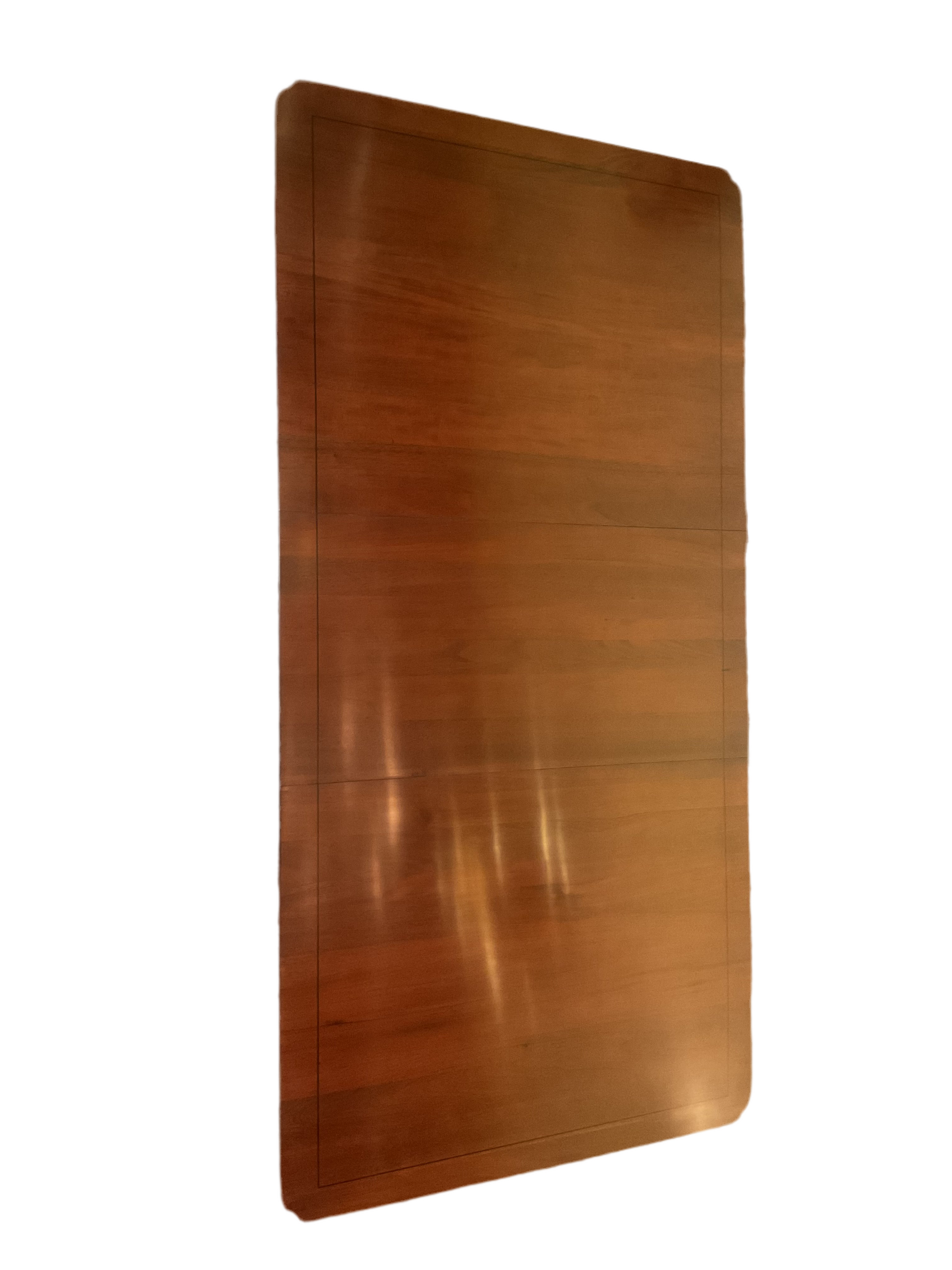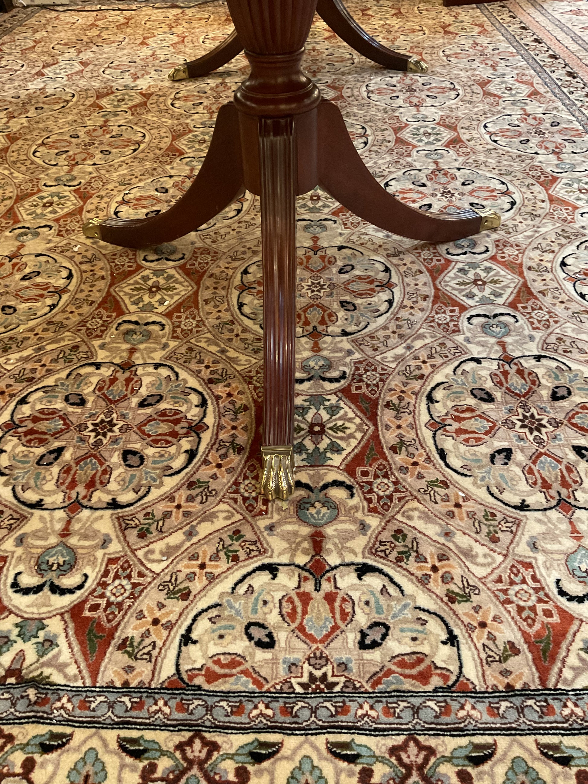 Regency style double pedestal mahogany dining table with two 22” leaves.