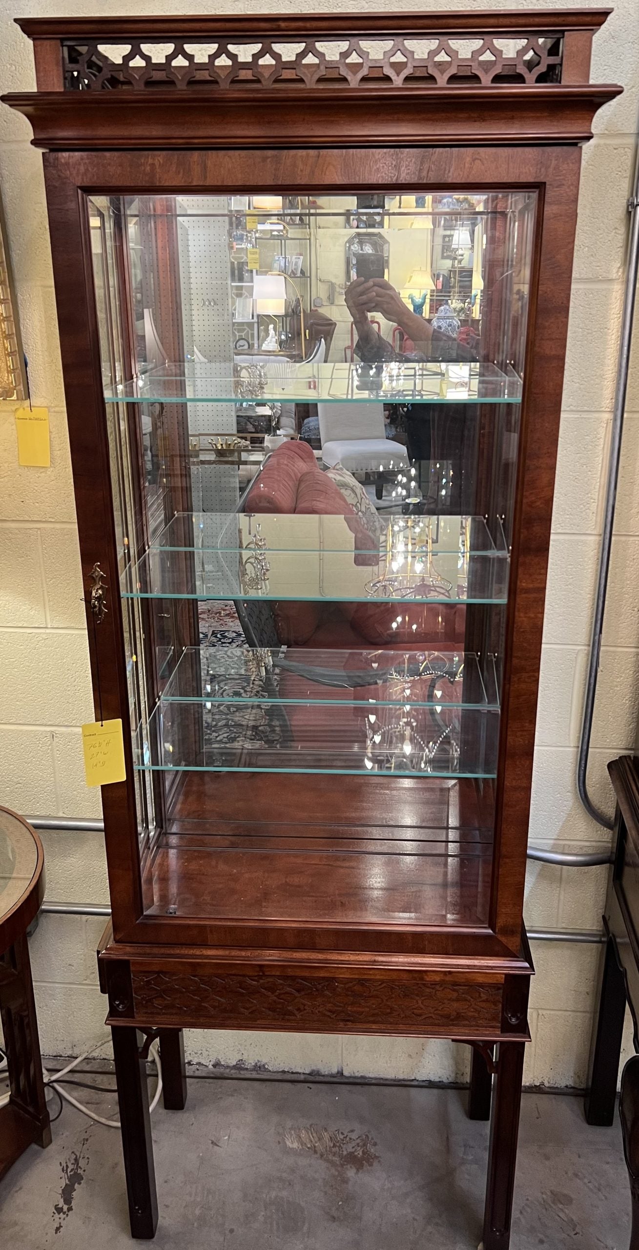 Mahogany curio cabinet By Century Furniture. Two dimmable lights , side drawer and adjustable glass shelves.