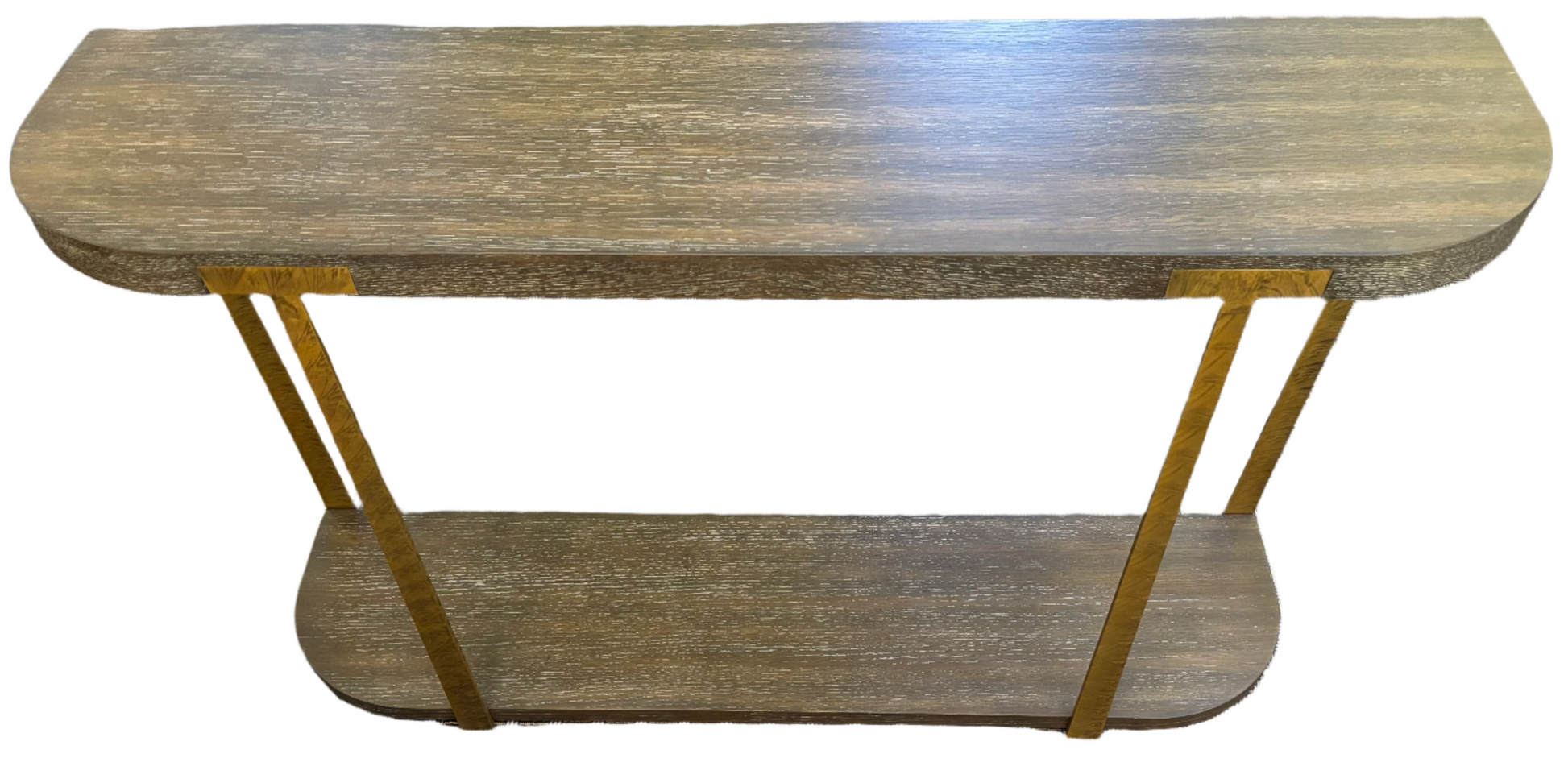 Two tier oak and gold metal console table.