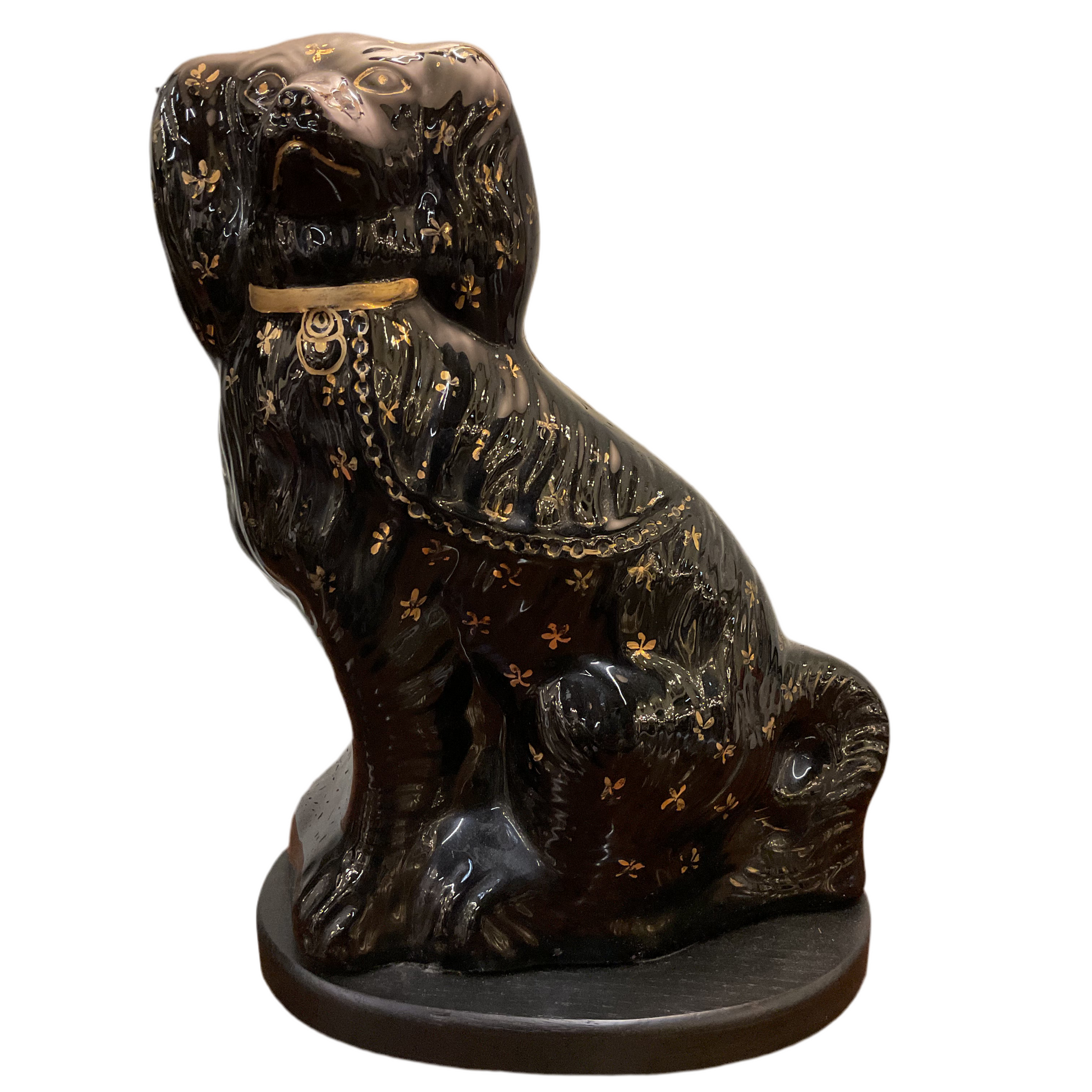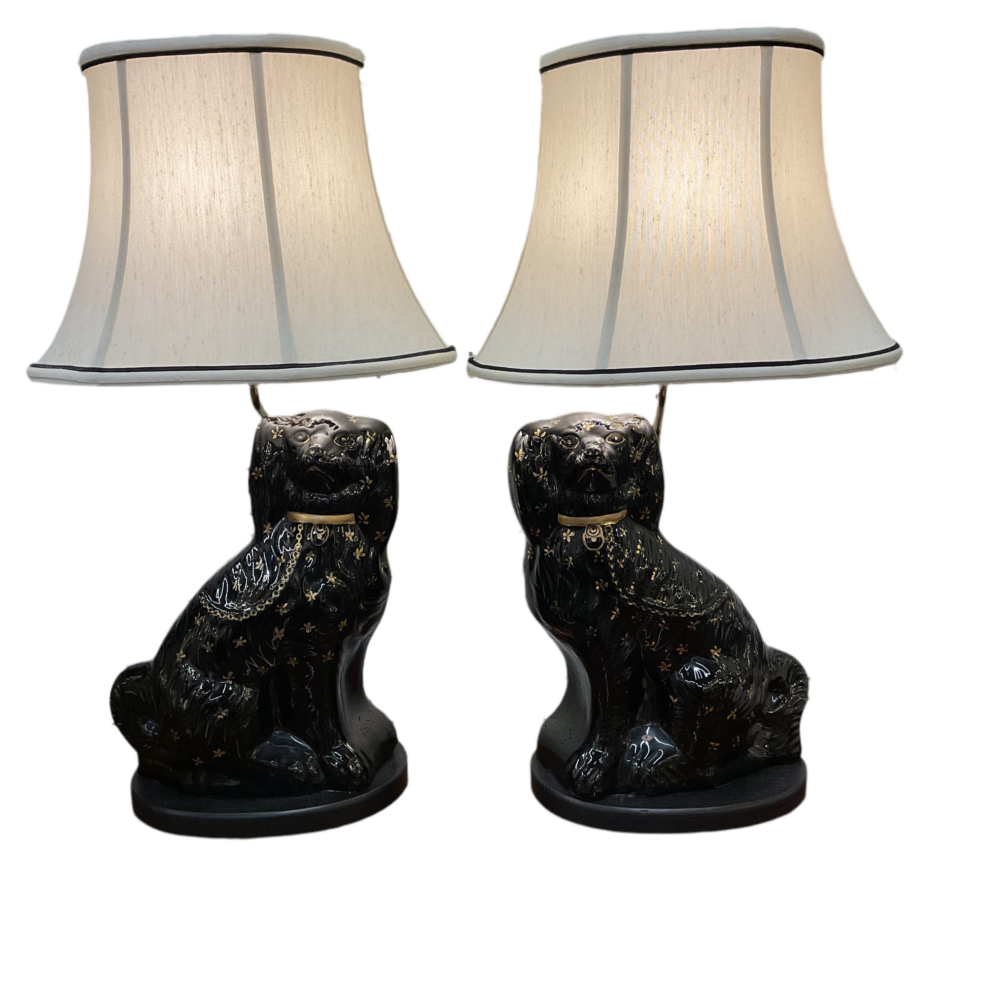 Pair of black & gold vintage Staffordshire dog lamps. 27”H. 15”W. 10”D