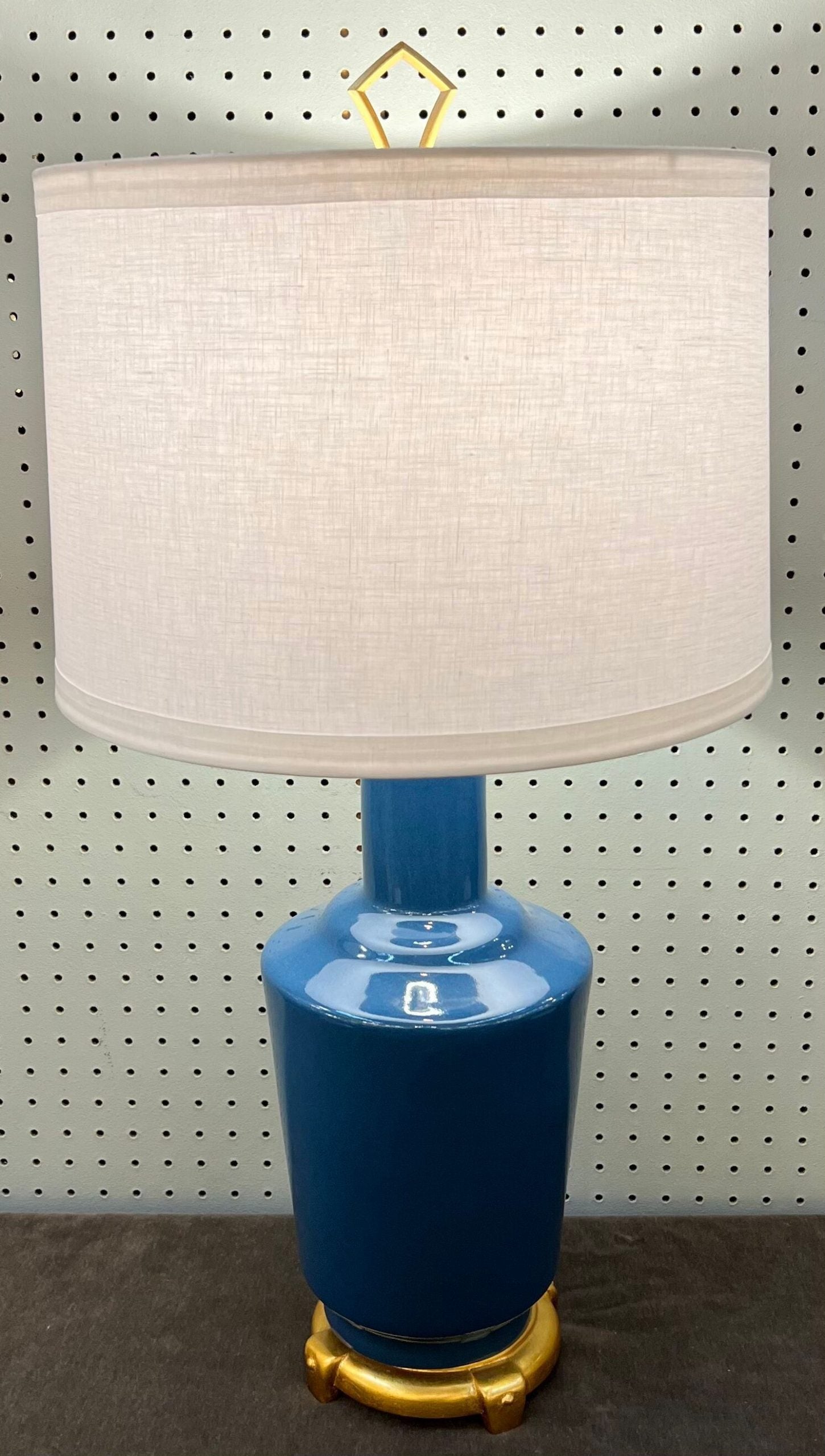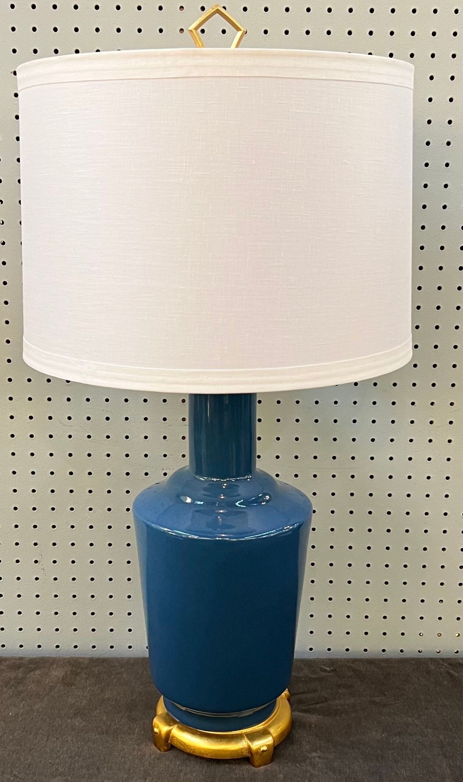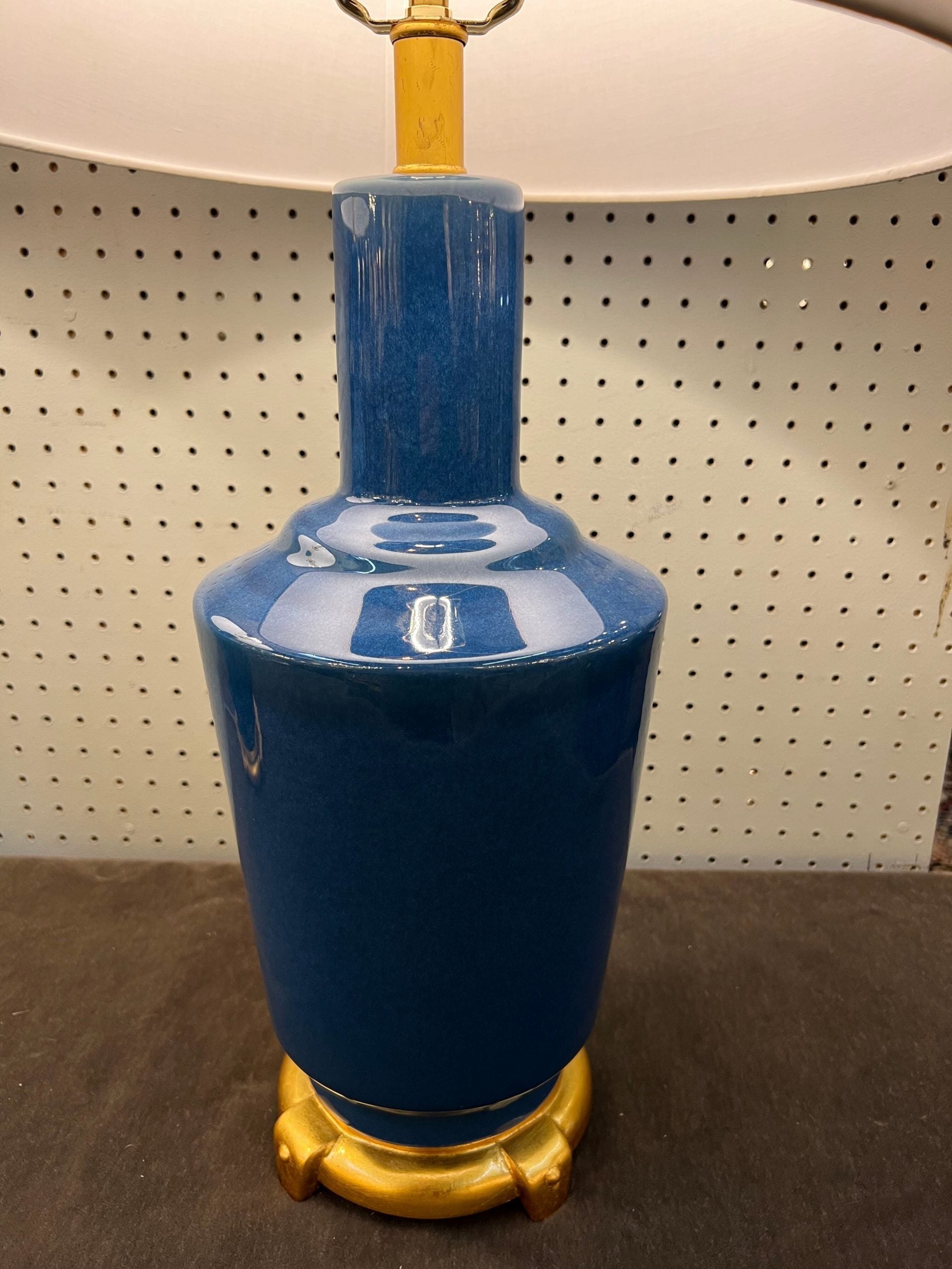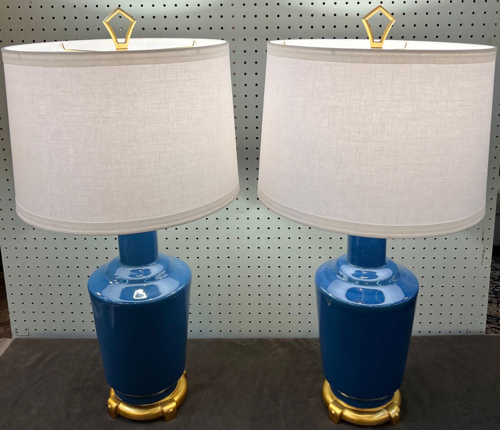 Pair Blue Vase Form Lamps On Gold Leaf Base. 31"H. 16"Dia