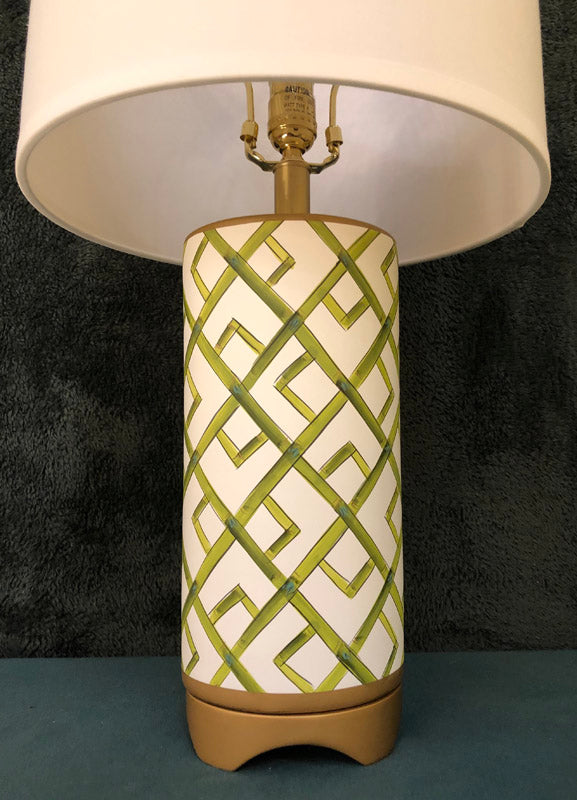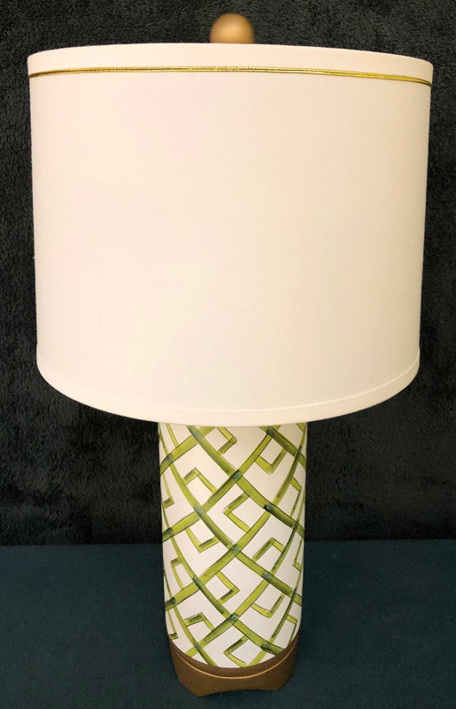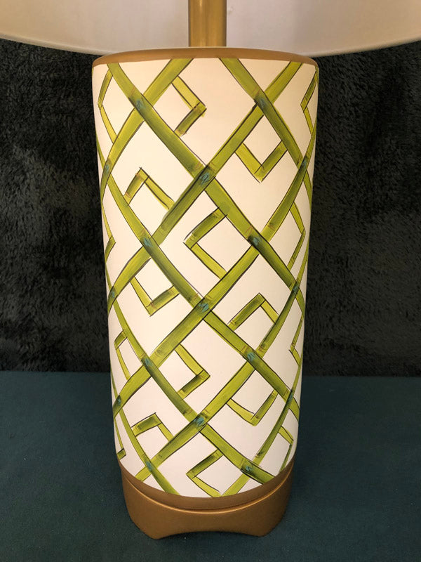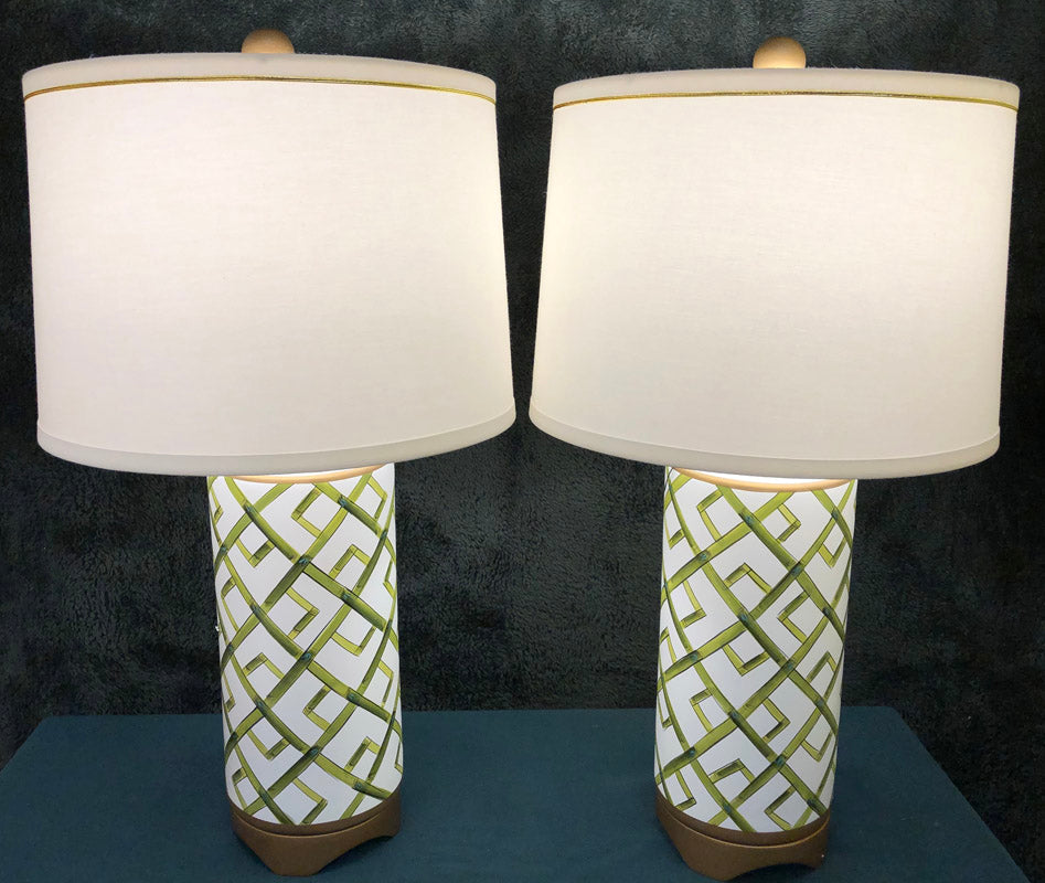 Pair of green hand painted bamboo design lamps 26"H 6"Dia (Shade 10"H 17"Dia)