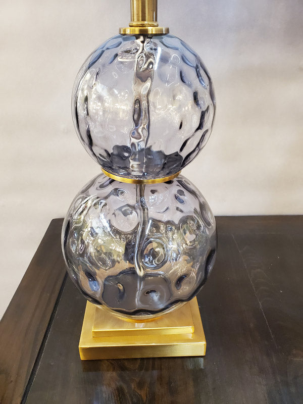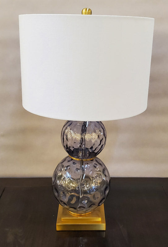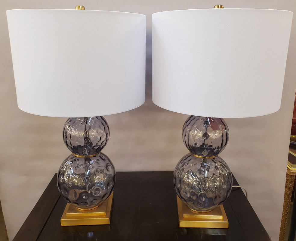 Pair of moderne lilac glass lamps with brass bass and a round shade 27"H. 15"Dia.