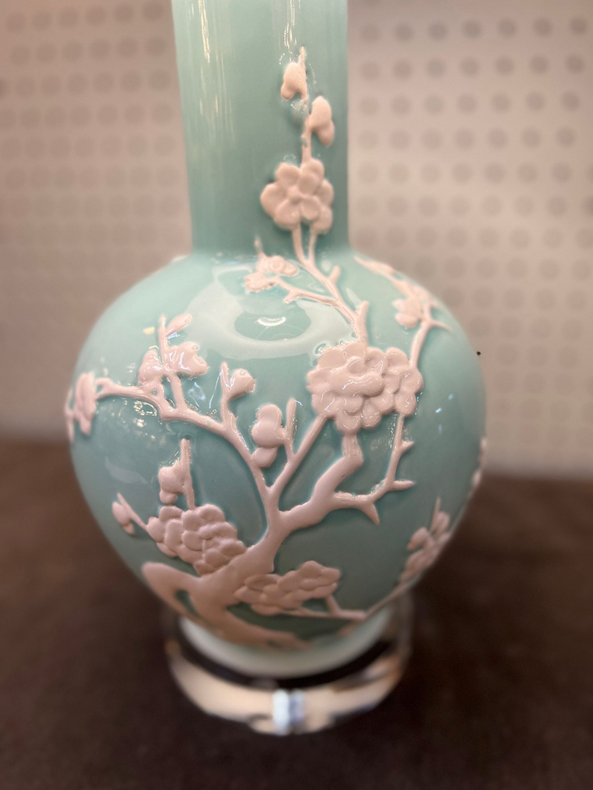 Pair Teal Cherry Blossom Lamps On Silver Leaf Base. 27"H. 12"Dia