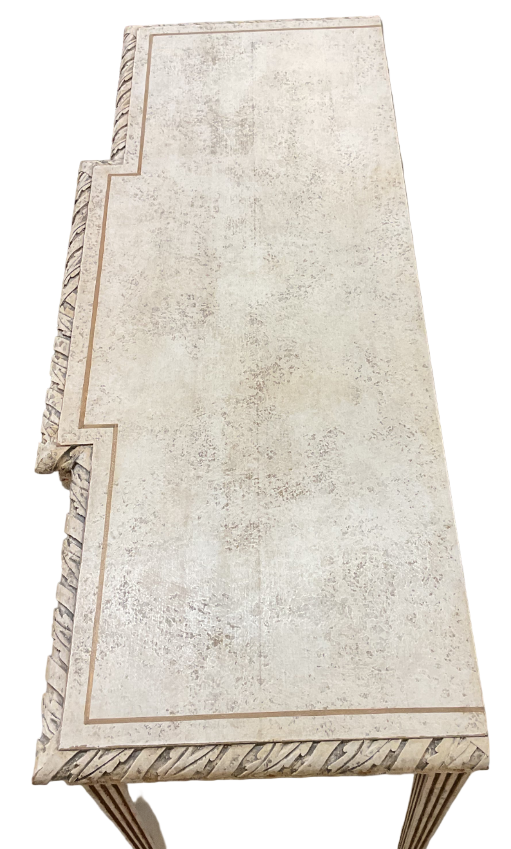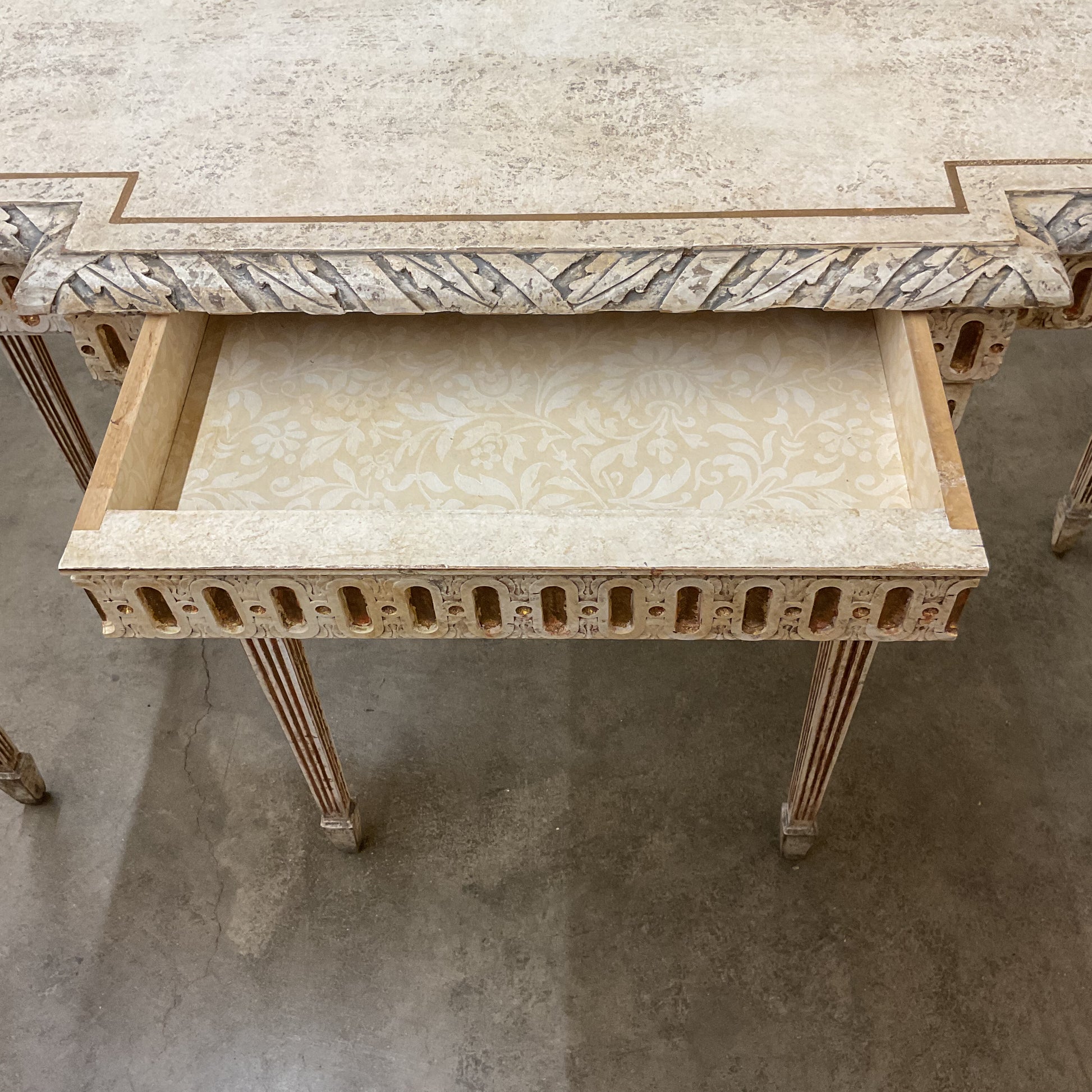 Pair of vintage cream console tables with drawer and gilded accents. 31”H. 50”W. 19.25”D.