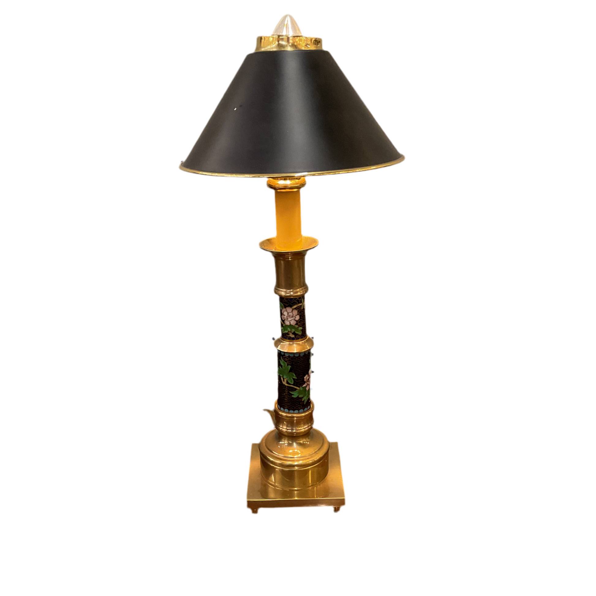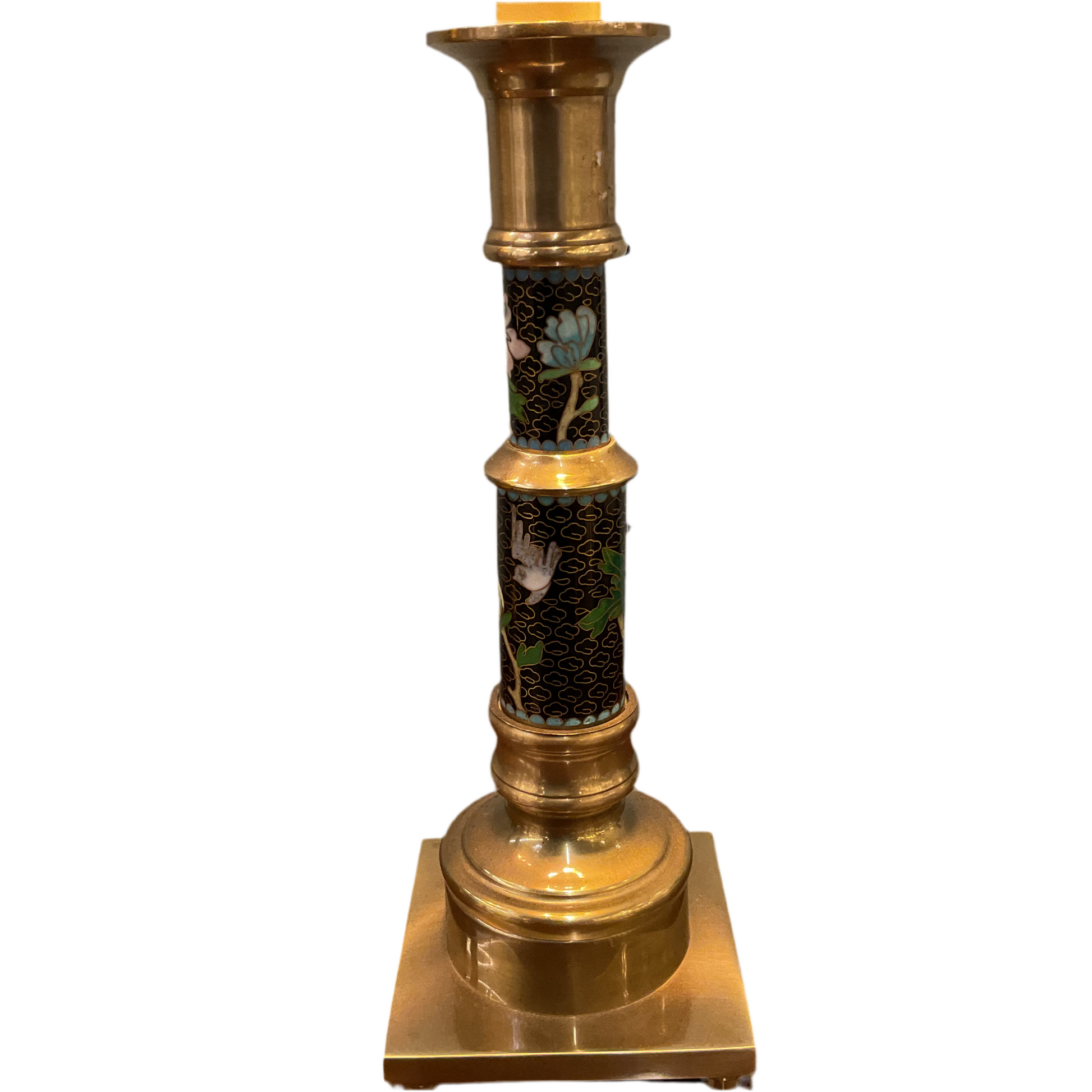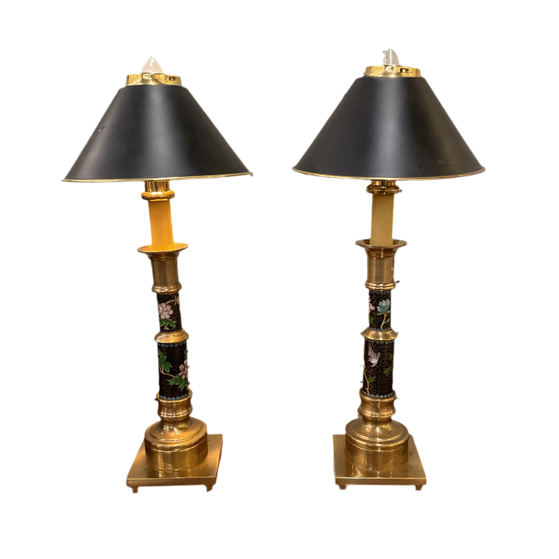 Pair brass candlesticks Cloisonné lamps with a black metal shade. 16”H. 7”Dia