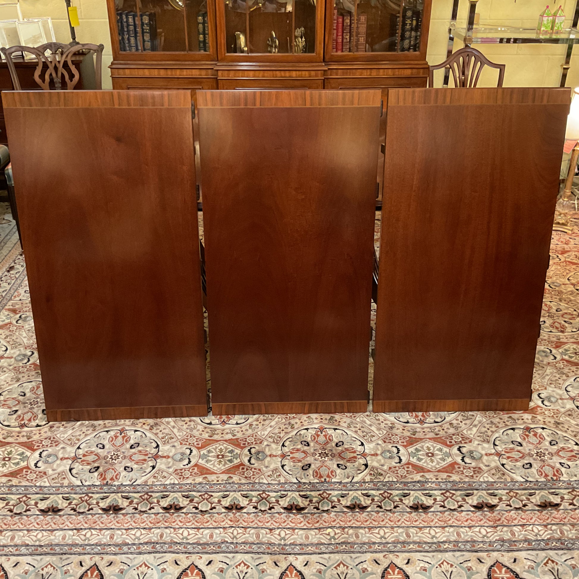 Regency style mahogany double pedestal by Smith & Watson New York. Brass casters and pull down leaf support. Three 22.25” leaves. 30”H. 44”D. 66”L. 133”L (fully open).