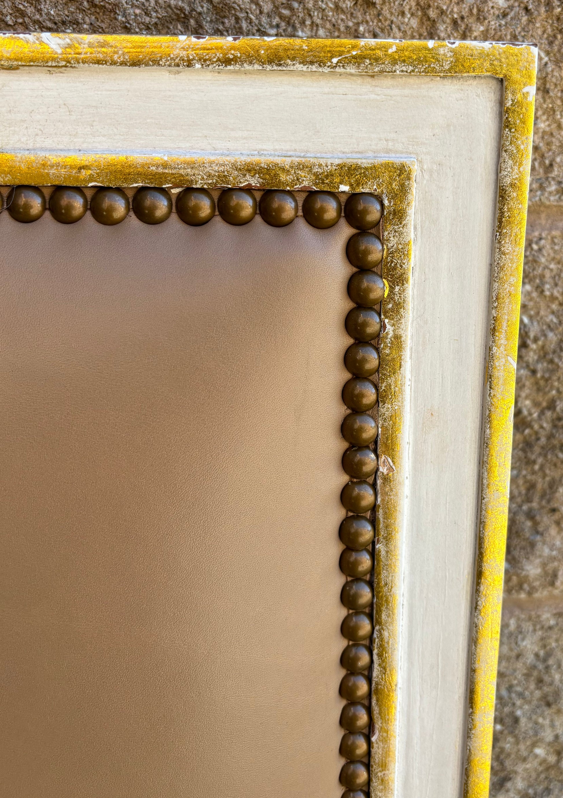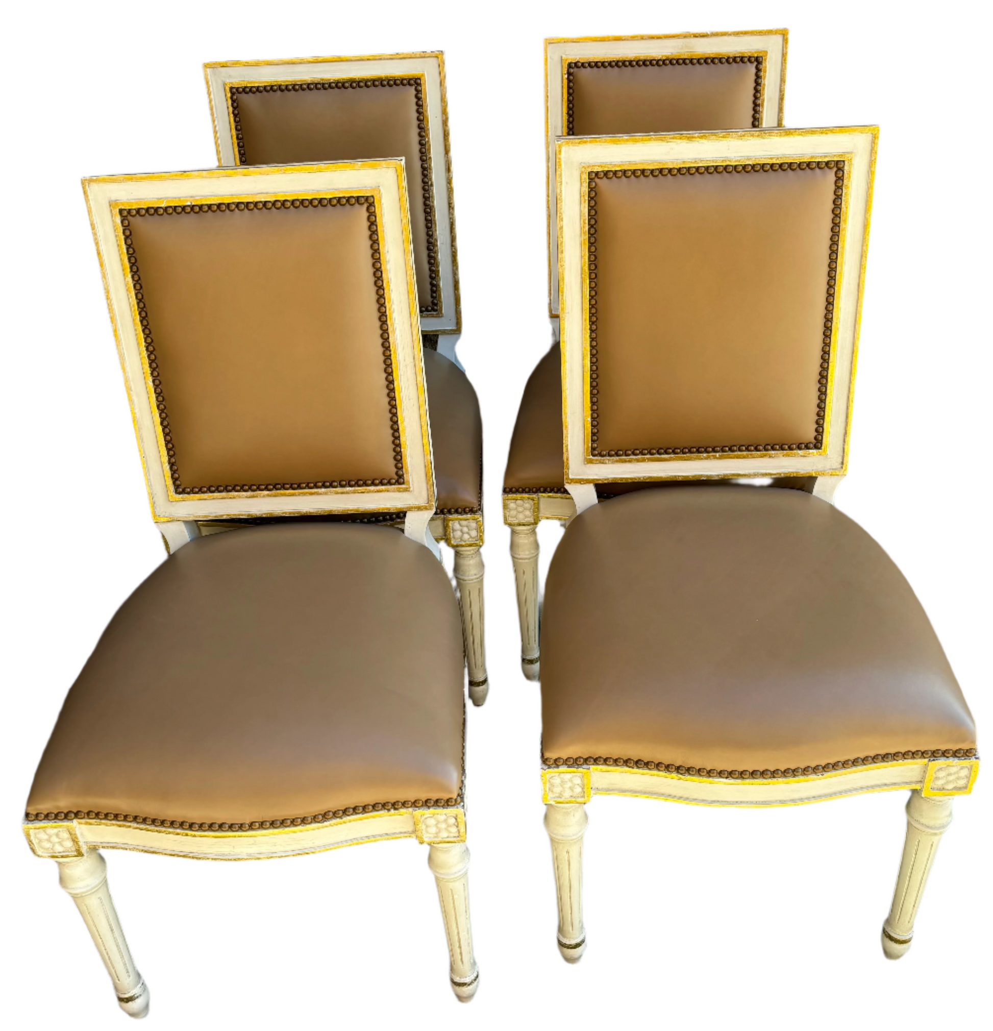 Set 4 Louis XVI caramel leather chairs with gilt finish and nailhead trim.