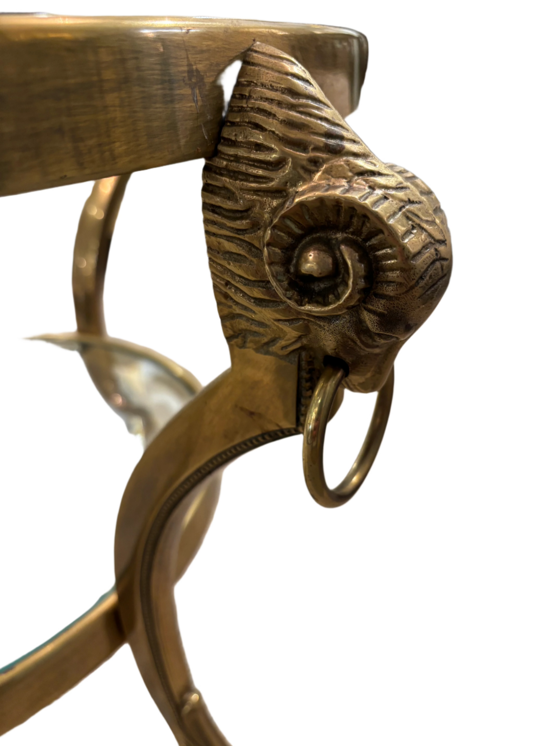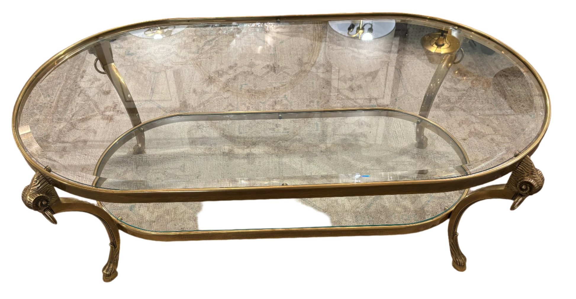 Vintage Maison Jensen glass and brass rams head coffee table. Two tier glass.